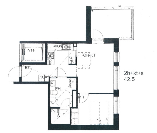 Kerrostalo, 2h + kt + sauna + kph + lasitettu parveke, 42.5 m2 |